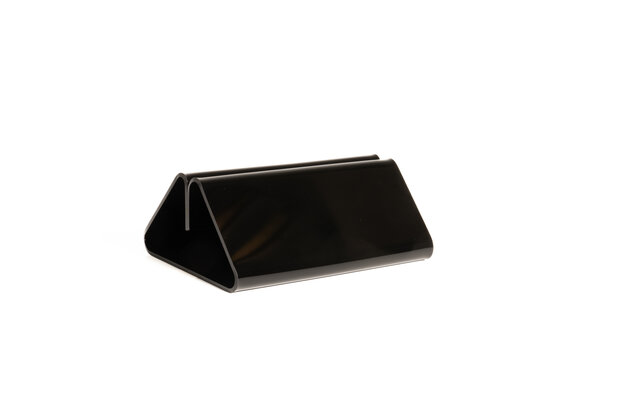 Deze houders zijn ideaal voor het presenteren van informatie op tafels, balies of toonbanken. De kaarthouders zijn geschikt voor het insteken van documenten met een maximale dikte van 4mm. Dit maakt deze houder ook geschikt voor neerzetten van bijvoorbeeld acrylglas displays of krijtbordjes. Toepassing De toepassingen van deze houder zijn bijzonder veelzijdig. Denk bijvoorbeeld aan: Horeca: Veel gebruikt als menukaarthouder van menukaarten, drankenkaarten of speciale aanbiedingen op tafels in restaurants, cafés of hotels. Winkels: Ideaal voor het presenteren van prijzen, promoties of productinformatie in winkels en showrooms. Kantoor & receptie: Een professionele manier om bezoekersinformatie of instructies goed zichtbaar weer te geven. Beurzen & evenementen: Geschikt voor het tonen van uw bedrijfsinformatie of promoties op een beursstand of balie. Formaat Lengte: 10,5 cm Hoogte: 4,5 cm Diepte: 8 cm Materiaal Deze houders zijn gemaakt van zwart acrylglas.
