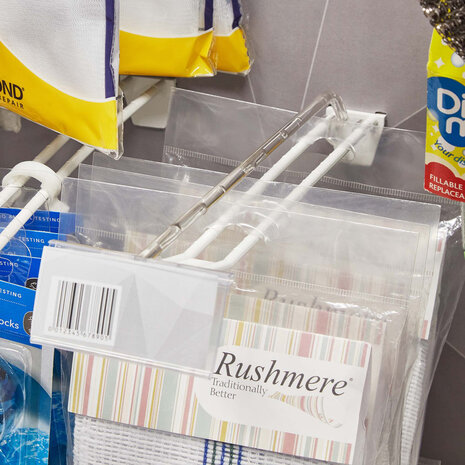 Deze prijskaarthouder bevestigt u eenvoudig aan de voorzijde van onze transparante arms & displayhaak-adapters. Ze hebben een breedte van 100 mm en zijn geschikt voor het presenteren van prijskaartjes met een hoogte van 39 mm. Specificaties Breedte: 100 mm Invoerhoogte: 39 mm Materiaal: Kunststof Kleur: Transparant