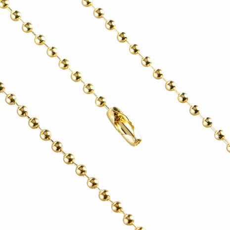 Deze kogelketting met sluiting is op maat gemaakt met een lengte van 15 cm. Ideaal voor diverse toepassingen, zoals het ophangen van meubelkaarthoezen, prijslabels of voor decoratieve doeleinden. Specificaties Lengte: 15 cm Kleur: Goud Kogeldiameter: 2,4mm