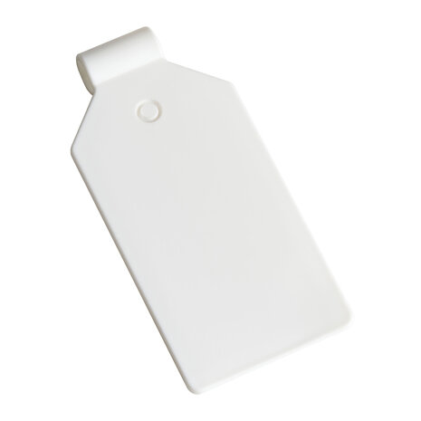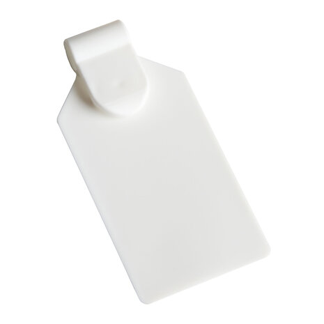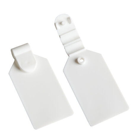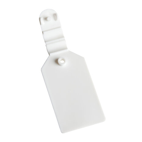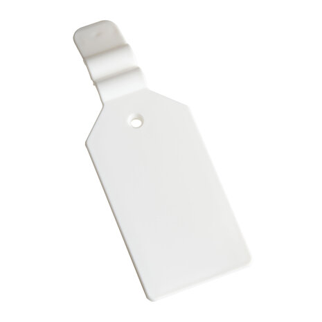 Prijslabel Met deze scanvaantjes bevestigt u eenvoudig prijskaartjes aan de voorzijde van onze dubbele displayhaken. Ze zijn geschikt voor stickers van 25 x 38 mm, die u eenvoudig op de scanvaantjes plakt De labels passen op displayhaken met een maximale dikte van 6 mm, waardoor ze geschikt zijn voor al onze displayhaken. Specificaties Materiaal: Kunststof Kleur: Wit