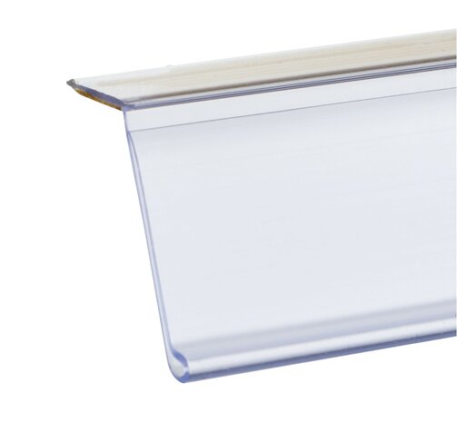 Deze zelfklevende prijsrail biedt een praktische en duurzame oplossing voor het weergeven van prijs- of productinformatie op winkelrekken en magazijnstellingen. Dankzij de sterke zelfklevende tape hecht de prijsrail eenvoudig en stevig op vrijwel elk type schap, waardoor het een betrouwbare, langdurige oplossing is die geen extra bevestigingsmaterialen vereist. De transparante voorzijde, met leeshoek van 15 graden, maakt het mogelijk om barcodes en prijsinformatie eenvoudig te scannen, wat deze scanrail ideaal maakt voor gebruik in winkels, magazijnen en andere opslaglocaties waar duidelijke en goed leesbare labeling essentieel is. Afmetingen Invoeghoogte: 39 mm Lengte: 1000 mm Heeft u een andere lengte nodig? Geen probleem. Mail uw wensen naar info@goodline.nl en we komen er z.s.m. bij u op terug Kenmerken: 15° leeshoek Materiaal: PVC Kleur: Transparant Extra info De plakrand is gemaakt van transparante tape. Op de afbeelding is dit rood ter illustratie