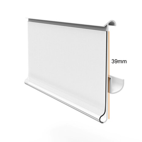 Let op: Door de lengte van dit artikel zijn de verzendkosten hoger dan gebruikelijk. Deze prijsrail is speciaal ontworpen voor gebruik op Tegometal, Eden, Mago, Linde, Storebest, en andere "Tego-compatibele" schappen. De strips zijn snel en eenvoudig te bevestigen door ze simpelweg tegen de rand van de plank te schuiven of te drukken. Dankzij het lijmvrije, clip-on ontwerp zijn de strips bovendien herbruikbaar, wat zorgt voor flexibiliteit in het gebruik. Het biedt een praktische en duurzame oplossing voor het weergeven van prijs- of productinformatie op winkelrekken en magazijnstellingen. De transparante voorzijde maakt het mogelijk om barcodes en prijsinformatie eenvoudig te scannen, wat deze scanrail ideaal maakt voor gebruik in winkels, magazijnen en andere opslaglocaties waar duidelijke en goed leesbare labeling essentieel is. Daarnaast voorkomt de geïntegreerde stofkap aan de bovenkant van de strip dat er vuil ophoopt, zodat uw prijskaartjes altijd zichtbaar en schoon blijven. Afmetingen Invoeghoogte: 39 mm Lengte: 1240 mm Heeft u een andere lengte nodig? Mail uw wensen naar info@goodline.nl en we komen er z.s.m. bij u op terug Kenmerken: Materiaal: PVC Kleur: Wit