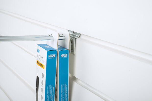Deze haken bieden een praktische en flexibele oplossing om producten overzichtelijk aan een lammelenwand / slatwall op te hangen.