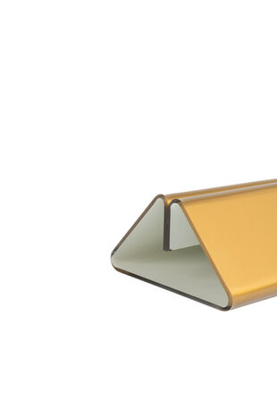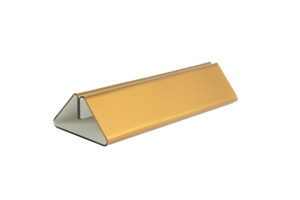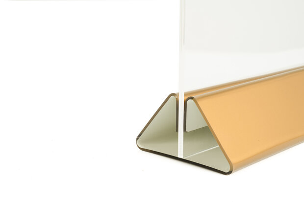 Deze houders zijn ideaal voor het presenteren van informatie op tafels, balies of toonbanken. De kaarthouders zijn geschikt voor het insteken van documenten met een maximale dikte van 4mm. Dit maakt deze houder ook geschikt voor neerzetten van bijvoorbeeld acrylglas displays of krijtbordjes. Toepassing De toepassingen van deze houder zijn bijzonder veelzijdig. Denk bijvoorbeeld aan: Horeca: Veel gebruikt als menukaarthouder van menukaarten, drankenkaarten of speciale aanbiedingen op tafels in restaurants, cafés of hotels. Winkels: Ideaal voor het presenteren van prijzen, promoties of productinformatie in winkels en showrooms. Kantoor & receptie: Een professionele manier om bezoekersinformatie of instructies goed zichtbaar weer te geven. Beurzen & evenementen: Geschikt voor het tonen van uw bedrijfsinformatie of promoties op een beursstand of balie. Formaat Lengte: 21 cm Hoogte: 4,2 cm Diepte: 8 cm Materiaal & Kleur Deze houders zijn gemaakt van transparant acrylglas (2mm) en aan de binnenzijde voorzien van een metallic gouden opdruk. Deze opdruk is hierna afgewerkt met een witte laag, zodat de gouden kleur extra goed opvalt. Omdat de bedrukking aan de binnenzijde van de houder is aangebracht, is deze optimaal beschermd tegen krassen, slijtage.