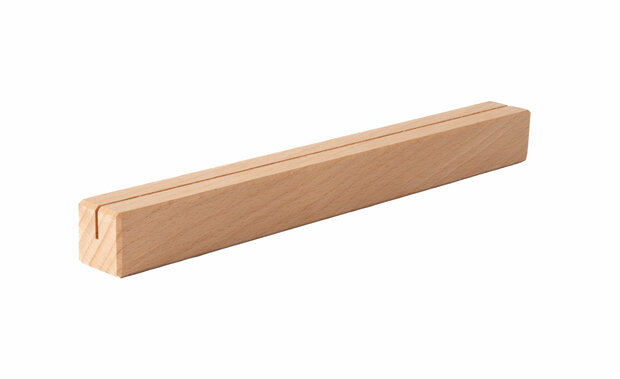 Houten houder Deze prachtige houten houders zijn perfect voor het op een tafel of balie presenteren van uw informatie. Deze houders zijn geschikt voor het insteken van documenten met een maximale dikte van 2mm. De toepassingen van deze houders zijn eindeloos, variërend van het tonen van menukaarten in een restaurant tot het promoten van aanbiedingen in een winkel, het presenteren van brochures/flyers op een beurs of het tentoonstellen van foto's bij een expositie. Formaat 30 cm x 3 cm x 3 cm Sleufbreedte: 2 mm Sleufdiepte: 1,5 cm Materiaal Gemaakt van hoogwaardig hout, biedt deze houder een natuurlijke en rustieke uitstraling die perfect past bij elke sfeer. Bedrukking De houders zijn standaard onbedrukt, maar kunnen op aanvraag worden voorzien van een bedrukking Voor meer informatie over alle mogelijkheden kunt u kijken op onze pagina "Bedrukking / Maatwerk".