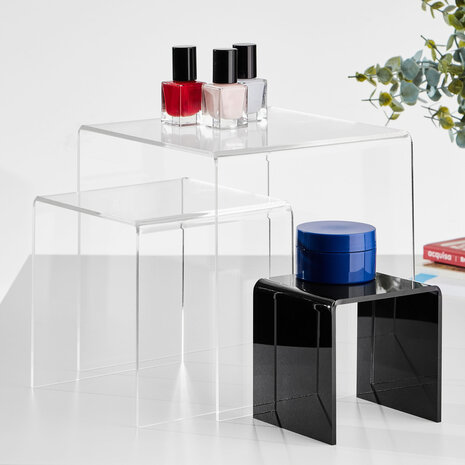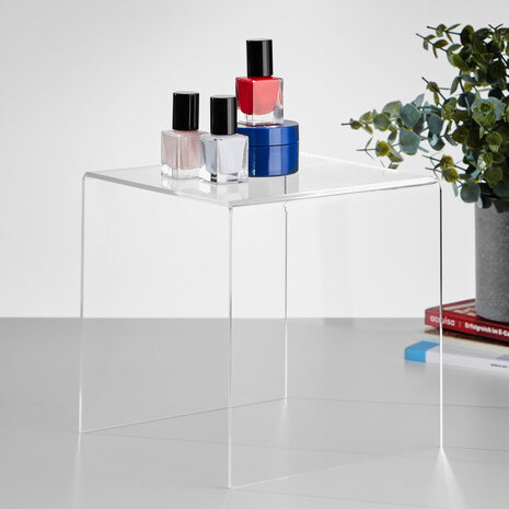 Display Deze acrylglas tafeldisplays worden vaak gebruikt in winkels om kleine producten zoals sieraden, cosmetica, elektronica en accessoires te presenteren. Ze zorgen voor een heldere en aantrekkelijke presentatie, waardoor klanten worden aangetrokken tot de producten. Maar ook op beurzen, kantoren of in musea worden deze acrylglas tafeldisplays veel gebruikt voor de presentatie van items. Afmeting 300 x 300 x 300 mm Materiaal: Transparant Acrylglas (4 mm dik)