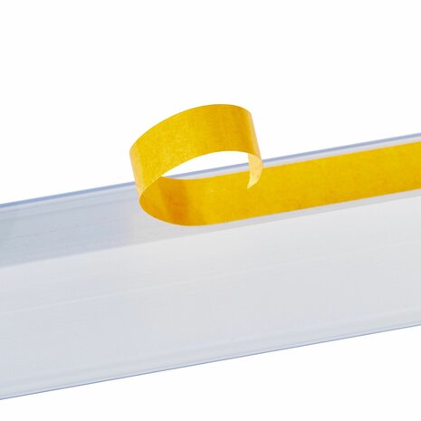 Deze zelfklevende prijsrail biedt een praktische en duurzame oplossing voor het weergeven van prijs- of productinformatie op winkelrekken en magazijnstellingen. Dankzij de sterke zelfklevende tape hecht de prijsrail eenvoudig en stevig op vrijwel elk type schap, waardoor het een betrouwbare, langdurige oplossing is die geen extra bevestigingsmaterialen vereist. De transparante voorzijde maakt het mogelijk om barcodes en prijsinformatie eenvoudig te scannen, wat deze scanrail ideaal maakt voor gebruik in winkels, magazijnen en andere opslaglocaties waar duidelijke en goed leesbare labeling essentieel is. Afmetingen Invoeghoogte: 39 mm Lengte: 54mm Heeft u een andere lengte nodig? Geen probleem. Mail uw wensen naar info@goodline.nl en we komen er z.s.m. bij u op terug Kenmerken: Materiaal: PVC Kleur: Transparant Extra info De plakrand is gemaakt van transparante tape. Op de afbeelding is dit rood ter illustratie