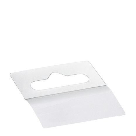 Display Hangers Heeft uw product geen hanger voor uw displayhaken? Geen probleem. Met onze zelfklevende displayhangers maakt u uw product eenvoudig geschikt voor ophangen. U plakt de hanger eenvoudig op uw product, waarna het probleemloos aan (display)haken bevestigd kan worden. Deze hangers zijn geschikt voor al onze enkele en dubbele displayhaken, waaronder lamellenwand- en gaatjeswand-displayhaken. Specificaties Materiaal: Kunststof Kleur: Transparant Afmeting: 50mm x 50mm Verpakt per 500 stuks