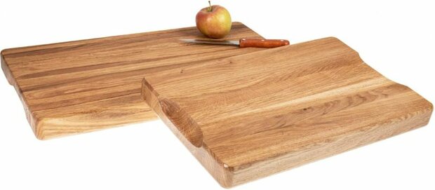 Deze houten snijplank is gemaakt van 4 cm dik Europees eikenhout en is voorzien van 2 handgrepen.