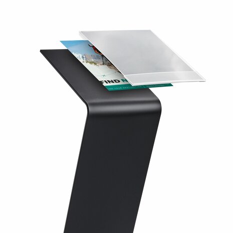 De houder heeft aan de bovenzijde een transparante posterhouder, geschikt voor A4-documenten.