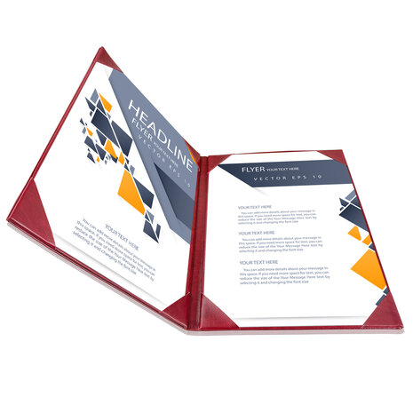Map voor 2 documenten op A4-formaat, waarbij elke pagina aan één zijde leesbaar is. Deze map is ideaal voor het stijlvol presenteren of overhandigen van offertes, brochures of belangrijke papieren. De mappen worden ook veel gebruikt tijdens presentaties, vergaderingen of sollicitatiegesprekken om een verzorgde en professionele indruk te maken. Bevestiging van uw documenten Uw A4 documenten worden op hun plaats gehouden door vier hoekstansingen, waardoor ze goed leesbaar zijn (zie afbeelding). Materiaal Deze map is vervaardigd uit zacht, hoogwaardig kunstleer, wat zorgt voor een luxe en stijlvolle uitstraling. Op zoek naar een andere kleur of bedrukte mappen? Op aanvraag is maatwerk mogelijk in diverse kleuren en afwerkingen. De mappen zijn standaard onbedrukt, maar kunnen worden voorzien van een bedrukking. Voor meer informatie over alle mogelijkheden kunt u kijken op onze pagina "Bedrukking / Maatwerk". Afmetingen Dichtgevouwen: 30,3 cm x 21.8 cm x 0,8 cm Opengevouwen: 30,3 cm x 44.7 cm x 0,4 cm