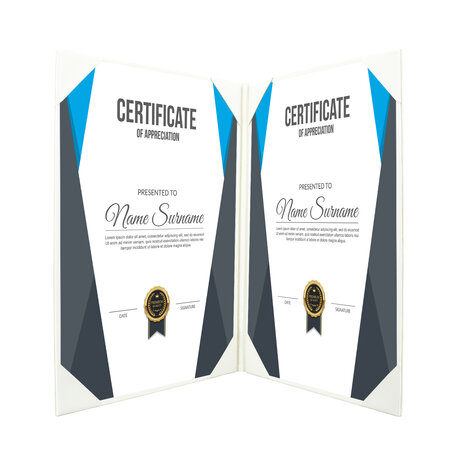 Map voor 2 documenten op A4-formaat, waarbij elke pagina aan één zijde leesbaar is. Deze diplomamap zorgt een stijlvolle presentatie van uw rapport, certificaat, diploma of andere documenten. Bevestiging van uw documenten Uw A4 certificaten / diploma's worden op hun plaats gehouden door vier hoekstansingen, waardoor ze goed leesbaar zijn (zie afbeelding). Materiaal Deze map is vervaardigd uit zacht, hoogwaardig kunstleer, wat zorgt voor een luxe en stijlvolle uitstraling. Op zoek naar een andere kleur of bedrukte mappen? Op aanvraag is maatwerk mogelijk in diverse kleuren en afwerkingen. De mappen zijn standaard onbedrukt, maar kunnen worden voorzien van een bedrukking. Voor meer informatie over alle mogelijkheden kunt u kijken op onze pagina "Bedrukking / Maatwerk". Afmetingen Dichtgevouwen: 30,3 cm x 21.8 cm x 0,8 cm Opengevouwen: 30,3 cm x 44.7 cm x 0,4 cm