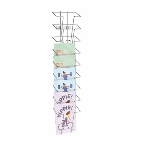 Presenteer uw folders, brochures, catalogi en ander promotiemateriaal op overzichtelijke en aantrekkelijke wijze met onze zilverkleurige staaldraad folderhouder.