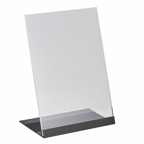 Tafelhouder / L-Standaard Deze transparante tafelhouders zijn de perfecte oplossing om uw A5-formaat informatie op een stijlvolle manier te presenteren. De houder bestaat uit 2 onderdelen: een heldere acrylglas houder en een zwarte aluminium voet. De houder wordt eenvoudig in de aluminium voet geschoven, waardoor een luxe en moderne variant van de klassieke L standaard ontstaat. Of u nu speciale aanbiedingen, openingstijden, huisregels, dagelijks menu's, of andere details wilt tonen, deze houders zijn goed te gebruiken voor al deze toepassingen. Formaat Geschikt voor een A4 formaat insert A4 = 210 mm X 148 mm (H x B) Materiaal De houders zijn gemaakt van transparant acrylglas met een dikte van 2 mm. Dit zorgt niet alleen voor een moderne uitstraling, maar maakt de houders ook duurzamer dan houders die zijn gemaakt van bijvoorbeeld 1,5 mm dik polystyreen (PS). Toepassingen Kantooromgeving: In kantoren zijn deze houders ideaal voor het organiseren van A5-formaat documenten, het presenteren van brochures en het tonen van belangrijke mededelingen op een balie of bureau. Horeca: In de horeca kunnen tafelhouders worden gebruikt om menu's, speciale aanbiedingen en promoties weer te geven. Educatieve Instellingen: In scholen en universiteiten zijn brochurehouders nuttig voor het verspreiden van informatie over cursussen, evenementen en andere educatieve activiteiten. Beurzen en Evenementen: Tijdens beurzen en evenementen zijn tafelstandaards en brochurehouders onmisbaar voor het tonen van marketingmateriaal en het verstrekken van informatie aan bezoekers. Retail: In winkels kunnen deze houders gebruikt worden om productinformatie, aanbiedingen en promoties weer te geven.