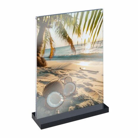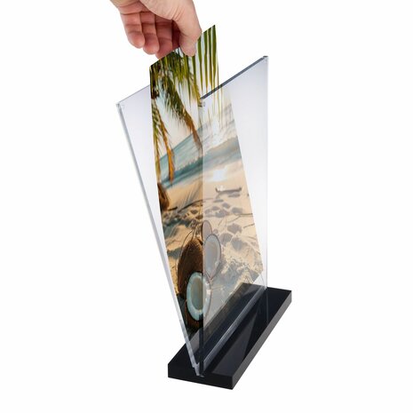 De houder bestaat uit twee delen van acrylglas van maar liefst 5 mm dik. Deze delen worden bij elkaar gehouden door kleine magneetjes, waardoor het wisselen van de inhoud snel gaat.