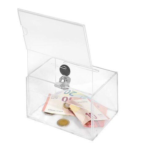 Transparante Box Deze transparante donatiebox is geschikt voor uiteenlopende toepassingen. Of het nu gaat om donaties, stemmen, suggesties of promotiecampagnes – deze box biedt een mooie oplossing en past vrijwel in elke omgeving. Geschikt voor diverse doeleinden Gebruik deze box bijvoorbeeld als: Donatiebox op balies, toonbanken of evenementen Ideeënbus voor personeel of klanten Suggestiebox in winkels, kantoren of wachtruimtes Stembus voor kleine verkiezingen, opiniepeilingen of feedbackrondes Inzamelbox voor kassabonnen, kleine formulieren of visitekaartjes Gebruiksvriendelijk en Veilig De box is voorzien van een gleuf aan de bovenzijde en wordt geleverd met een slotje en twee sleutels, zodat de inhoud beschermd blijft. Dankzij het compacte formaat is deze box makkelijk te plaatsen op elke balie of tafel. Duidelijke Informatievoorziening Boven de achterzijde van de box bevindt zich een transparant insteekvak, geschikt voor een poster in A6-formaat (liggend). Ideaal om extra informatie, instructies of promotieboodschappen zichtbaar te maken. Specificaties Afmeting box (zonder insteekbord): 163 x 97 x 135 mm Afmeting insteekbord: A6 (liggend) Afmeting gleuf: 86 x 7 mm Materiaal: Acrylglas Kleur: Transparant