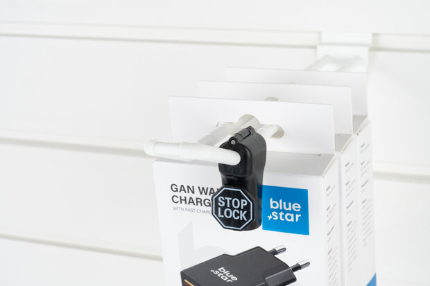 Anti-Diefstal Slot voor Displayhaak Bescherm uw winkelvoorraad tegen diefstal met deze display haaksloten. Dit anti-diefstal slot voorkomt dat artikelen ongewenst van dubbele wand- of displayhaken worden verwijderd. Ideaal voor gebruik in winkels, showrooms en andere omgevingen waar producten vrij toegankelijk gepresenteerd worden. Het slot is ontworpen voor dubbele displayhaken en kan eenvoudig worden geopend met een bijbehorende magneetsleutel. Maat Geschikt voor displayhaken met een diameter tot 6 mm Specificaties Materiaal: ABS Kleur: Zwart Toepassing: Dubbele display- en wandhaken