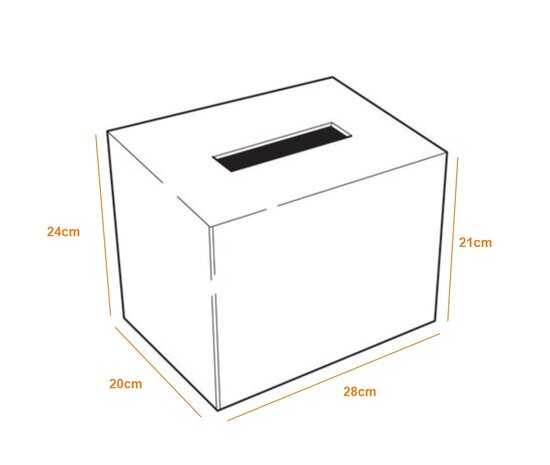 Kartonnen Box Deze witte box is te gebruiken als ideeënbus, donatiebox, visitekaartbox, stembus of andere inzamelacties. Specificaties Materiaal: Karton Kleur: Wit Afmeting Box: 200 x 240 x 280 mm Afmeting gleuf: 150 x 35 mm