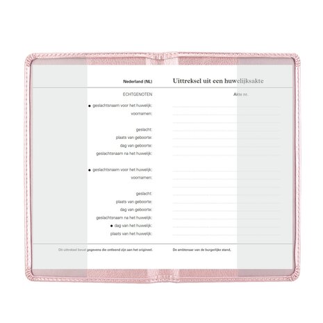 Mapje voor uw Trouwboekje Uw trouwboekje in dezelfde stijl als onze trouwakte mappen? Deze mapjes zijn gemaakt met dezelfde kleuren als onze trouwaktemappen, zodat ze goed bij elkaar passen. Materiaal Zachte hoge kwaliteit kunstleer Afmeting (H x B) Opengevouwen: 18 cm x 22 cm Dichtgevouwen: 18 cm x 10.8 cm Geschikt voor trouwboekjes van maximaal 16,5 cm x 10.5 cm (dichtgevouwen)
