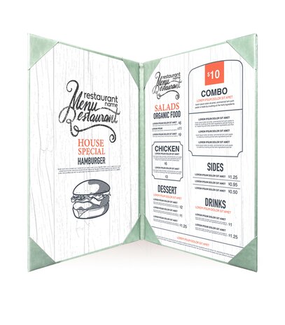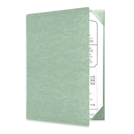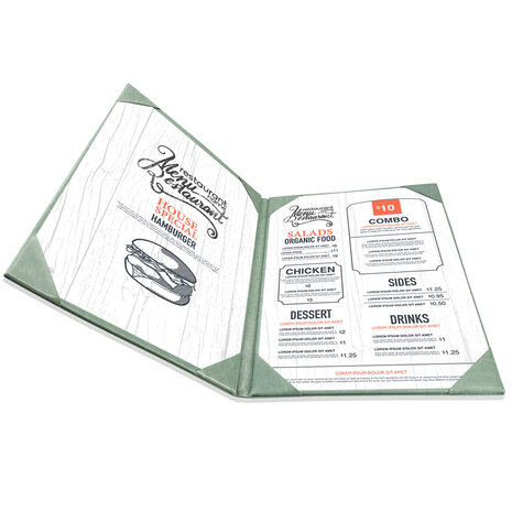 Menumap voor 2 menukaarten op A4 formaat, waarbij elke pagina aan één zijde leesbaar is. Deze menumap zorgt voor een stijlvolle presentatie van uw dinerkaart, lunchkaart, dessertkaart, wijnkaart en drankkaart. Ideaal voor restaurants, cafés, hotels, bistro’s en andere horecagelegenheden. Bevestiging van uw menukaart Uw A4 menukaarten worden op hun plaats gehouden door vier hoekstansingen, waardoor ze eenvoudig verwisselbaar zijn (zie afbeelding). Materiaal Deze menumap is vervaardigd uit zacht, hoogwaardig kunstleer, wat zorgt voor een luxe en stijlvolle uitstraling. Groot voordeel van dit materiaal is dat u de menumappen zeer gemakkelijk schoon kunt maken met een vochtige doek. Op zoek naar een andere kleur of bedrukte mappen? Op aanvraag is maatwerk mogelijk in diverse kleuren en afwerkingen. De mappen zijn standaard onbedrukt, maar kunnen worden voorzien van een bedrukking. Voor meer informatie over alle mogelijkheden kunt u kijken op onze pagina "Bedrukking / Maatwerk". Afmetingen Dichtgevouwen: 30,3 cm x 21.8 cm x 0,8 cm Opengevouwen: 30,3 cm x 44.7 cm x 0,4 cm