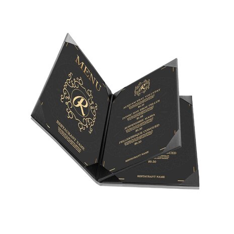 Menumap voor 4 menukaarten op A4 formaat, waarbij elke pagina aan één zijde leesbaar is. Deze menumap zorgt voor een stijlvolle presentatie van uw dinerkaart, lunchkaart, dessertkaart, wijnkaart en drankkaart. Ideaal voor restaurants, cafés, hotels, bistro’s en andere horecagelegenheden. Bevestiging van uw menukaart Uw A4 menukaarten worden op hun plaats gehouden door vier hoekstansingen, waardoor ze eenvoudig verwisselbaar zijn (zie afbeelding). Materiaal Deze menumap is vervaardigd uit zacht, hoogwaardig kunstleer, wat zorgt voor een luxe en stijlvolle uitstraling. Groot voordeel van dit materiaal is dat u de menumappen zeer gemakkelijk schoon kunt maken met een vochtige doek. Op zoek naar een andere kleur of bedrukte mappen? Op aanvraag is maatwerk mogelijk in diverse kleuren en afwerkingen. Kijk ter inspiratie bij onze mappen voor 2x A4 en ontdek de verschillende kleuropties en stijlen. De mappen zijn standaard onbedrukt, maar kunnen worden voorzien van een bedrukking. Voor meer informatie over alle mogelijkheden kunt u kijken op onze pagina "Bedrukking / Maatwerk". Afmetingen Dichtgevouwen: 30,3 cm x 22.2 cm x 1,7 cm Opengevouwen: 30,3 cm x 45,7 cm x 0,4 cm