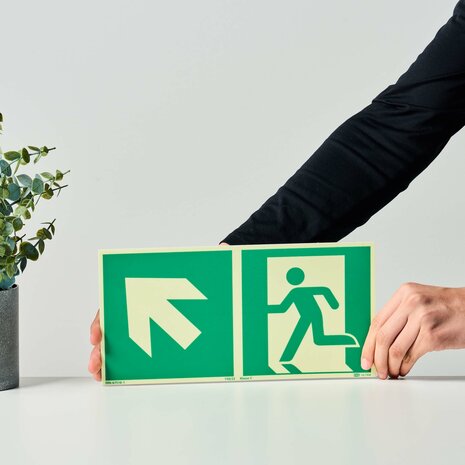 Dit kunststof nooduitgangsbord (type E001) heeft een afmeting van 300 x 150 mm met een dikte van 1 mm. Dankzij de zelfklevende achterkant is het bord eenvoudig en snel te bevestigen op gladde oppervlakken zoals muren, metaal of hout. Voor minder egale ondergronden kan aanvullend montagelijm worden gebruikt.