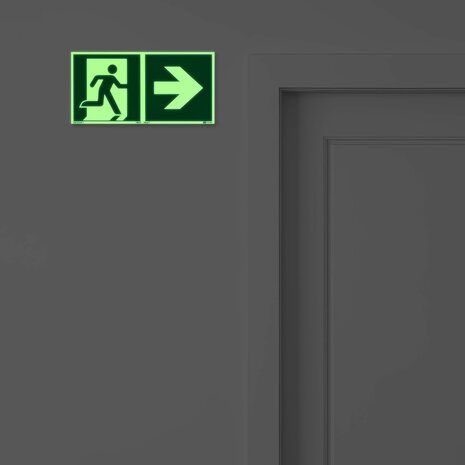 Het bord is voorzien van een lichtgevend oppervlak (fotoluminescent, conform DIN 67510-1, klasse C) en blijft ook bij stroomuitval of in slecht verlichte ruimtes goed zichtbaar. De lichtsterkte bedraagt 150/22 mcd/m², wat zorgt voor betrouwbare herkenbaarheid tot minstens een uur na het wegvallen van verlichting.