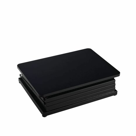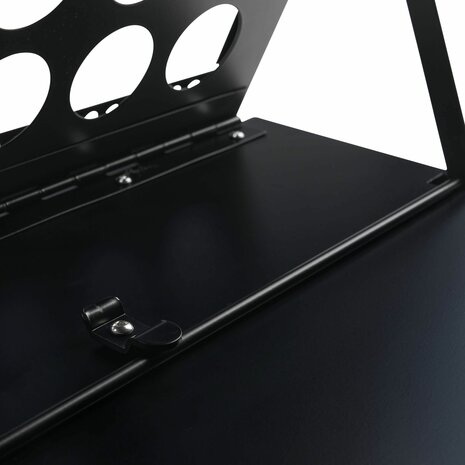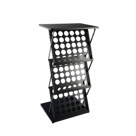 Deze opvouwbare beursbalie is de perfecte keuze voor beurzen, evenementen, presentaties en promotionele activiteiten. Met een strak en professioneel ontwerp biedt de balie niet alleen een representatieve uitstraling, maar ook functionele opbergruimte voor folders, brochures en andere documentatie. De balie biedt ruimte voor 6x A4-formaat (of 3x A3-formaat) folders, brochures of andere documenten. Dankzij het uitvouwbare ontwerp is de balie eenvoudig op te zetten en weer in te klappen, zonder dat er gereedschap nodig is. Dit maakt het een ideale oplossing voor mobiel gebruik. Met de meegeleverde opbergtas is de balie gemakkelijk te meenemen. Specificaties Kleur: Zwart Breedte 51 cm Hoogte 101 cm Diepte 42 cm Materiaal: Staal Gewicht: 9 kg