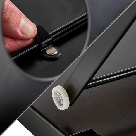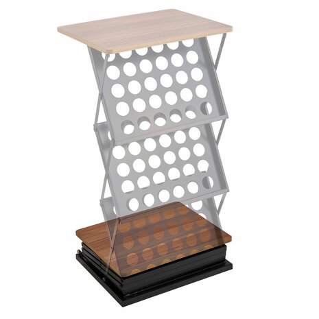 Deze opvouwbare beursbalie is de perfecte keuze voor beurzen, evenementen, presentaties en promotionele activiteiten. Met een strak en professioneel ontwerp biedt de balie niet alleen een representatieve uitstraling, maar ook functionele opbergruimte voor folders, brochures en andere documentatie. De balie biedt ruimte voor 6x A4-formaat (of 3x A3-formaat) folders, brochures of andere documenten. Dankzij het uitvouwbare ontwerp is de balie eenvoudig op te zetten en weer in te klappen, zonder dat er gereedschap nodig is. Dit maakt het een ideale oplossing voor mobiel gebruik. Met de meegeleverde opbergtas is de balie gemakkelijk te meenemen. Specificaties Kleur: Zwart/Beuken Breedte 51 cm Hoogte 101 cm Diepte 42 cm Materiaal: Staal & Hout Gewicht: 8 kg