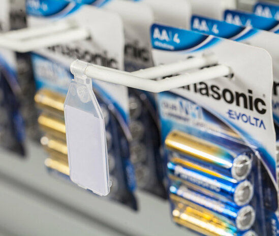 Prijslabel Met deze scanvaantjes bevestigt u eenvoudig prijskaartjes aan de voorzijde van onze dubbele kunststof displayhaken. Ze zijn geschikt voor kaartjes van 25 x 38 mm, die u eenvoudig in de scanvaantjes steekt. Type: Small-4 Deze labels passen uitsluitend op onze kunststof displayhaken. Deze haken hebben aan de voorzijde een speciale versmalling van 4mm voor het bevestigen van deze Small-4 scanvaantjes. Voor metalen displayhaken adviseren wij onze Wide-6 scanvaantjes. Deze zijn universeler en geschikt voor displayhaken met een maximale dikte van 6 mm. Specificaties Materiaal: Kunststof Kleur: Transparant